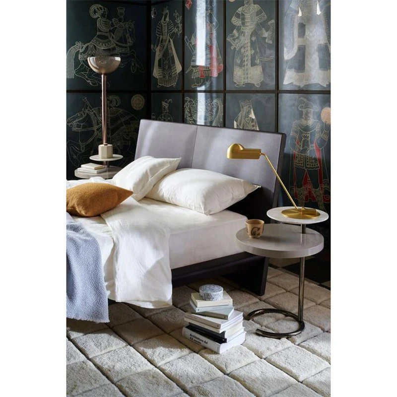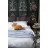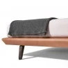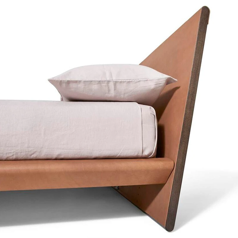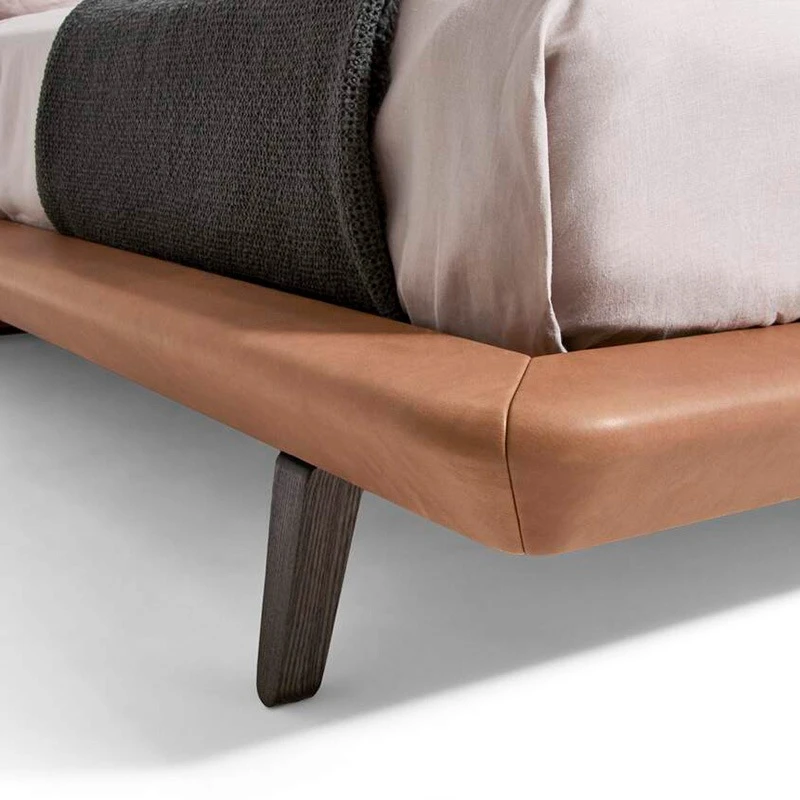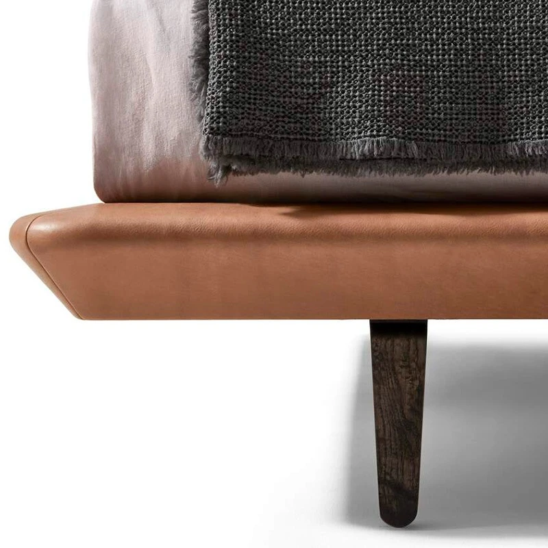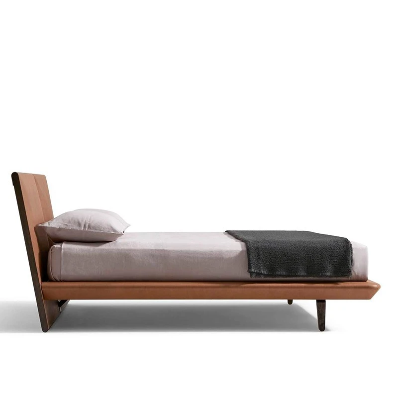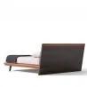 Kopfteil aus furnierter Spanplatte mit Massivholzeinlagen, mokka gebeizt mit Lederbezug